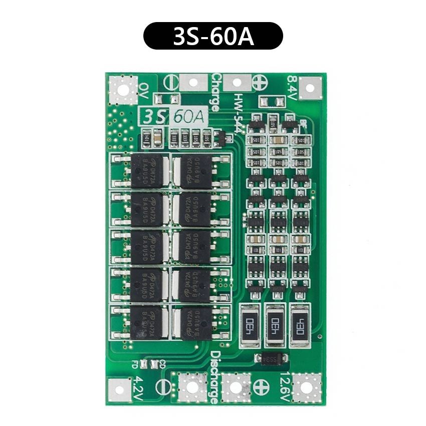 El BMS 3S 60A (Battery Management System) es una placa de protección y balanceo diseñada para paquetes de baterías de litio 3S (3 celdas en serie).