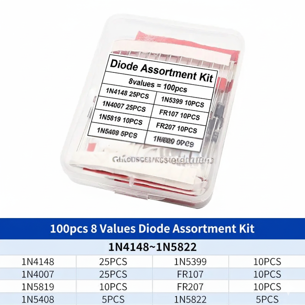 El Kit de Diodos 1N4148 ~ 1N5822 (100 piezas) es un surtido esencial para cualquier técnico, aficionado o estudiante de electrónica. Incluye una selección de 8 tipos de diodos de uso común, ideales para rectificación, protección, conmutación y proyectos electrónicos.