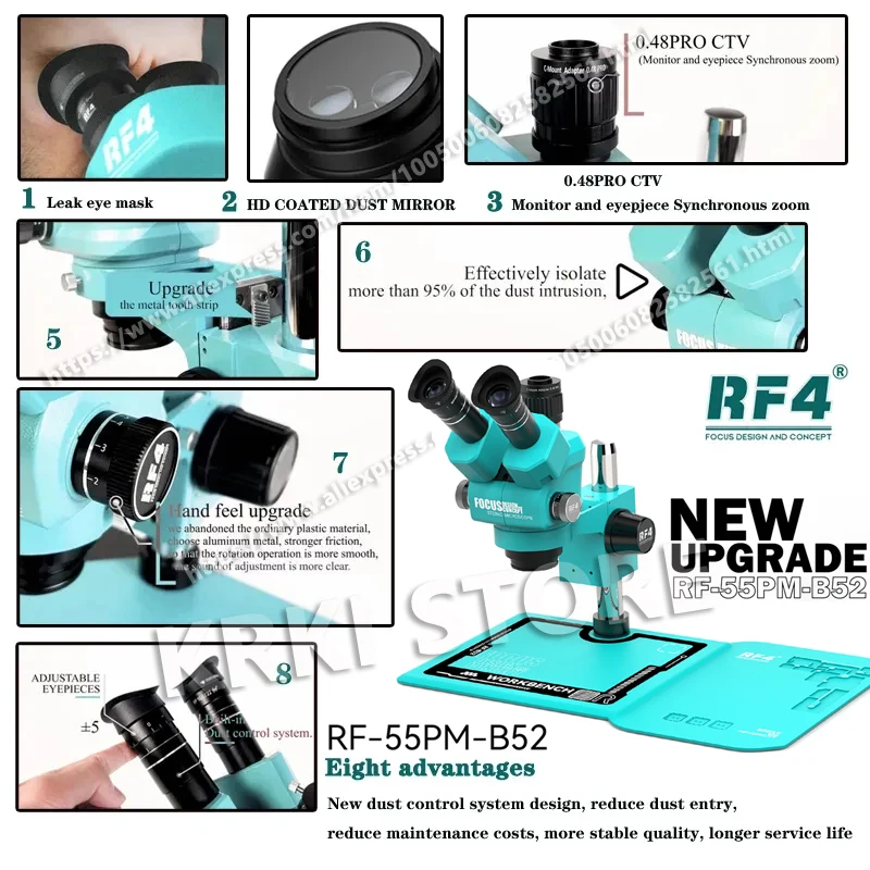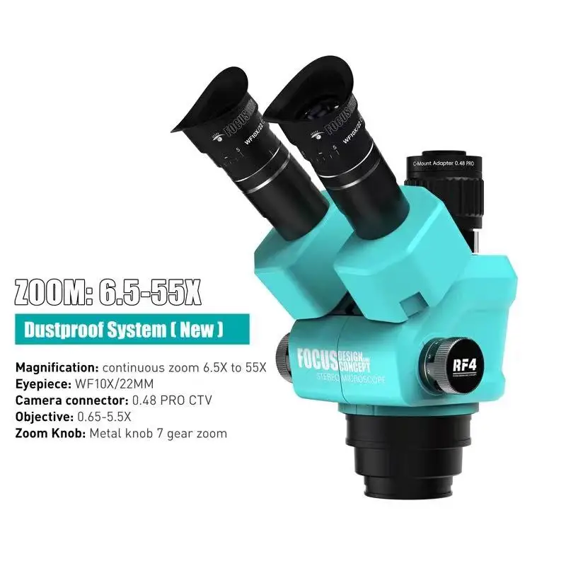 Microscopio estereoscópico RF4 RF-55PM-B52 con sistema antipolvo, zoom óptico y luz LED, ideal para electrónica, microsoldadura y precisión 🔬✨