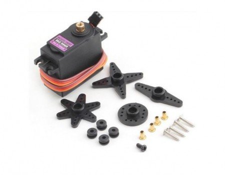 El Servo Motor MG996R (90°) es un servo de alto torque diseñado para tareas que requieren fuerza y precisión en un rango de movimiento de 90°. Gracias a sus engranajes metálicos reforzados, ofrece una larga vida útil y excelente durabilidad bajo carga.